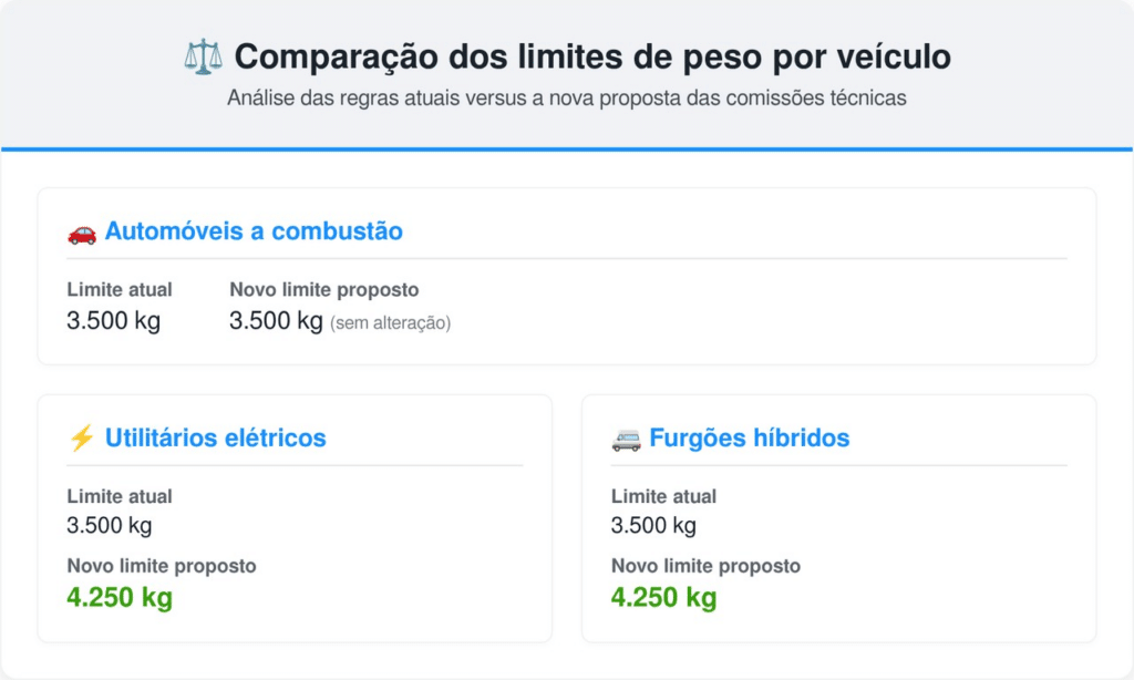 Atualmente, motoristas habilitados na categoria comum podem conduzir veículos com peso bruto total de até 3.500 kg. No entanto, os conjuntos de baterias dos carros elétricos modernos adicionam uma massa significativa que ultrapassa facilmente essa barreira legal.