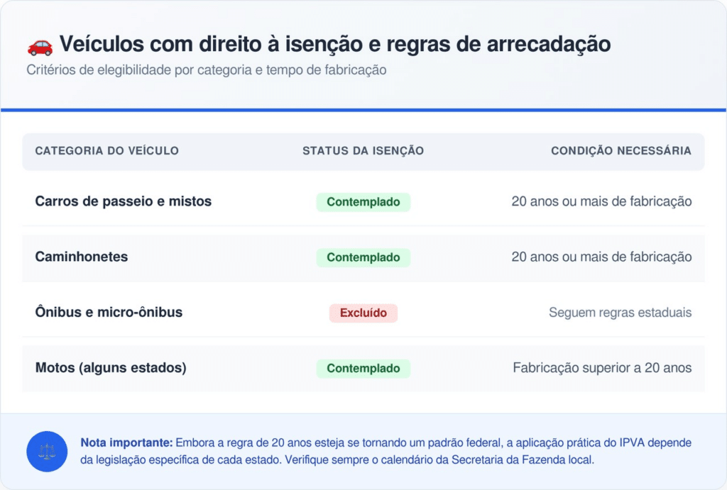 Abaixo, detalhamos quais veículos garantem o direito e quais permanecem na regra geral de arrecadação: