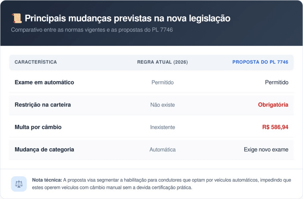 O PL 7746/2017 busca oficializar a separação das categorias, permitindo que o cidadão escolha um processo de aprendizagem simplificado. Se o motorista optar por não aprender a usar a embreagem, sua carteira virá com uma anotação proibindo a condução de modelos com câmbio manual.