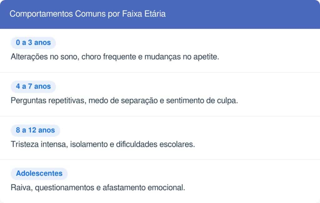 Na infância, o luto nem sempre é verbalizado. Muitas crianças expressam a dor por meio de comportamentos, o que pode ser confundido com birra ou desatenção. Sinais como retraimento, alterações no sono e regressão de habilidades indicam que a criança está tentando lidar com a perda.