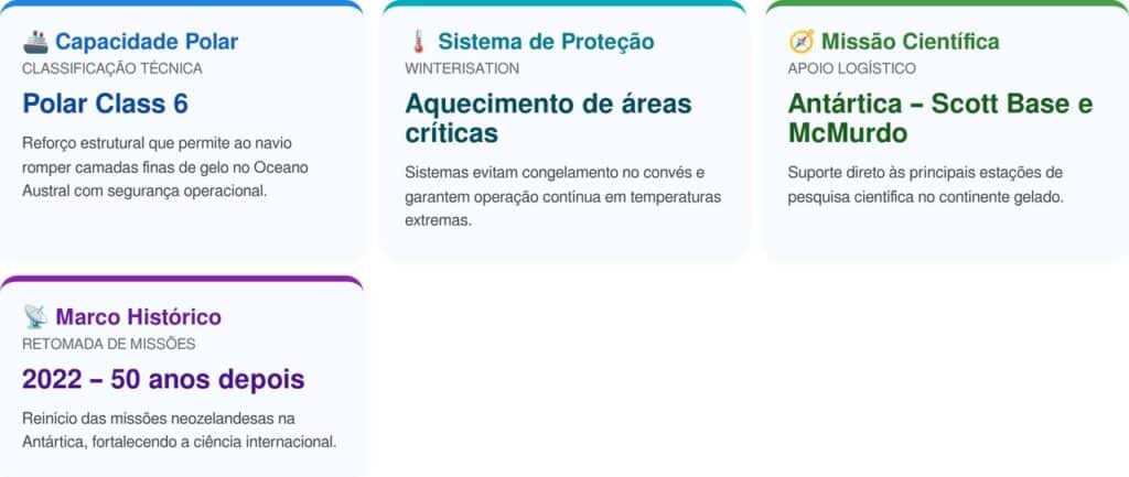 O HMNZS Aotearoa recebeu reforço estrutural de classe Polar Class 6, o que o torna apto a romper camadas finas de gelo no Oceano Austral. Ele conta com sistemas de winterisation, que incluem o aquecimento de áreas críticas do convés para evitar o congelamento e garantir a segurança operacional. Veja os detalhes:
