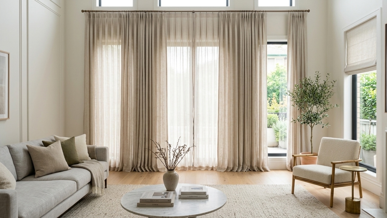 No design de interiores, o tecido da cortina influencia tanto a estética quanto a funcionalidade. Para a técnica de cortina alta, tecidos fluidos são os mais indicados. O linho sintético é uma excelente opção, pois não amassa facilmente e filtra a luz natural com suavidade. Isso garante privacidade sem bloquear completamente a iluminação.