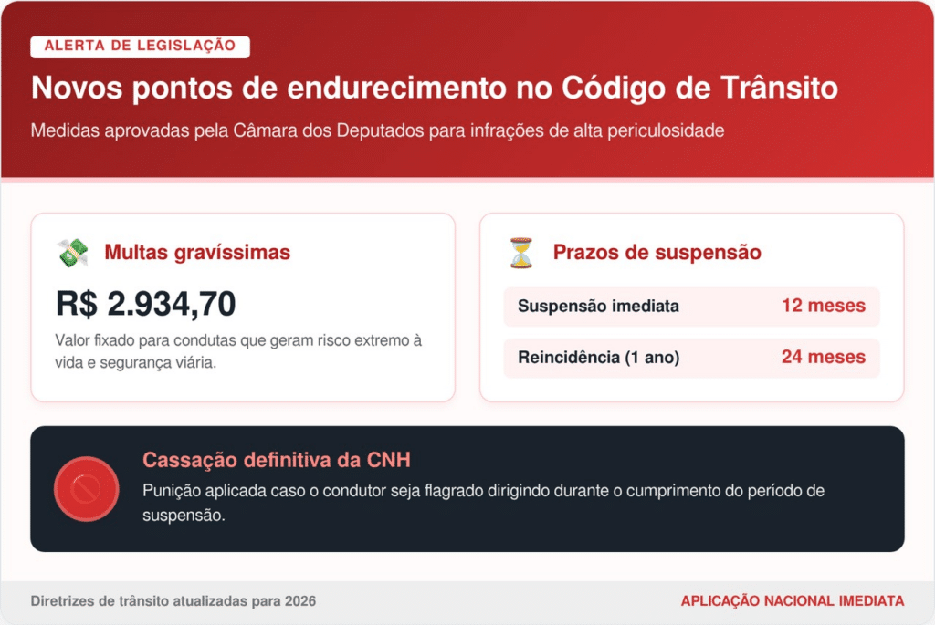 Enquanto o acesso pode ser facilitado para os mais jovens, a punição para motoristas imprudentes deve se tornar muito mais severa. O projeto apresentado pelo deputado Clodoaldo Magalhães foca diretamente no combate às manobras perigosas e ultrapassagens arriscadas.