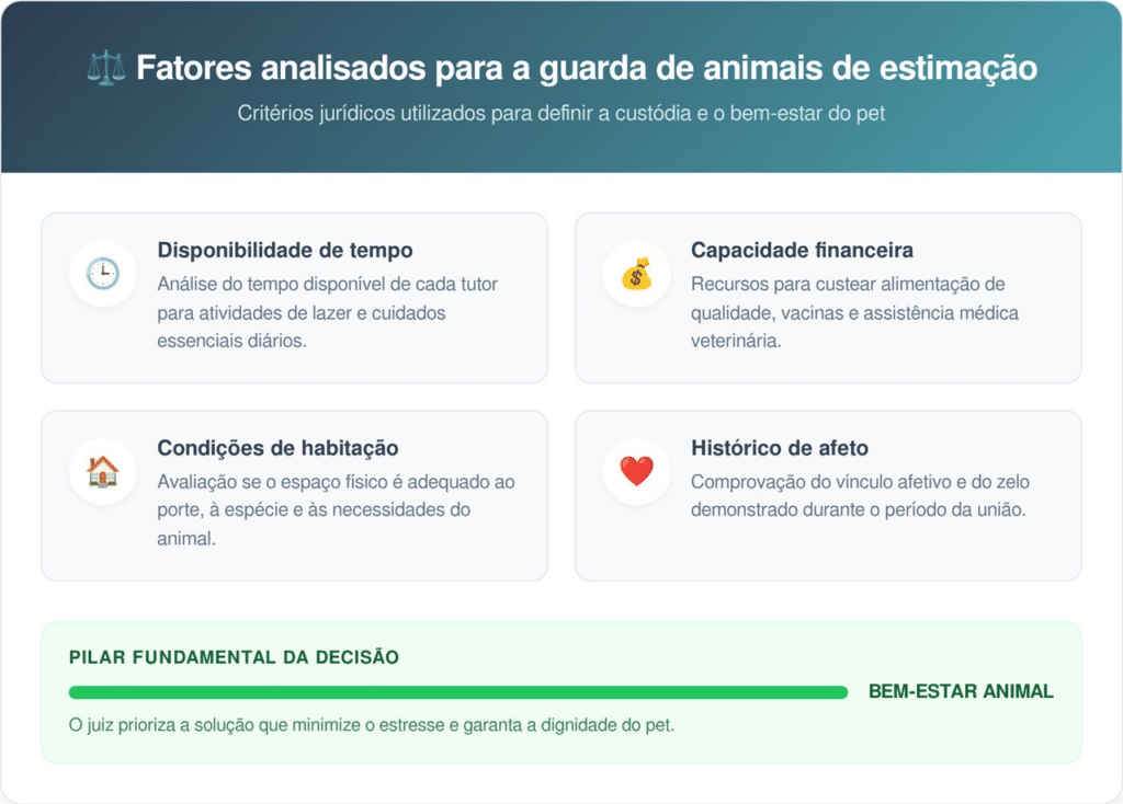 A regra geral estabelecida pelo magistrado, na ausência de consenso entre as partes, é o compartilhamento da custódia. O juiz avalia quem demonstra maior histórico de cuidado e possui melhores condições de moradia para abrigar o animal de forma digna.