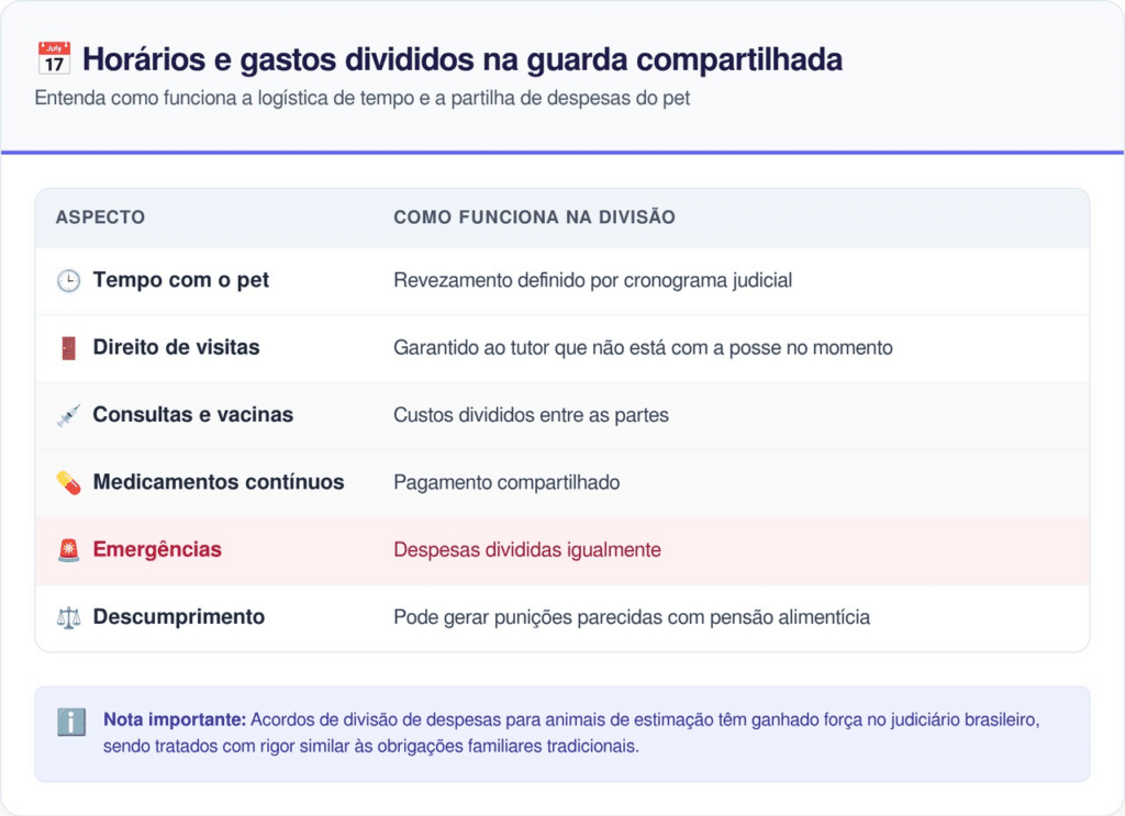 Na prática, tanto o tempo com o pet quanto as despesas entram numa divisão equilibrada entre os ex-tutores. Custos como consultas veterinárias, vacinas, remédios contínuos e até cirurgias de emergência devem ser compartilhados.