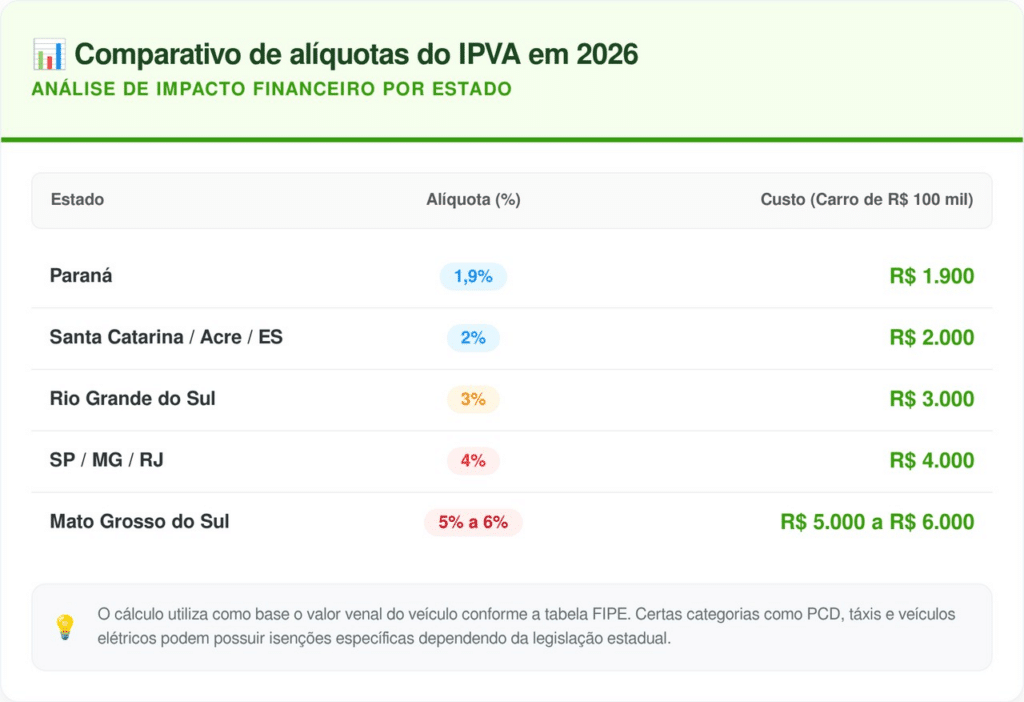 Em São Paulo, Minas Gerais e Rio de Janeiro, a alíquota permanece em 4% para veículos de passeio, representando mais do que o dobro do valor cobrado no Paraná. Já o Mato Grosso do Sul é o estado com o IPVA mais caro, com alíquotas entre 5% e 6%.