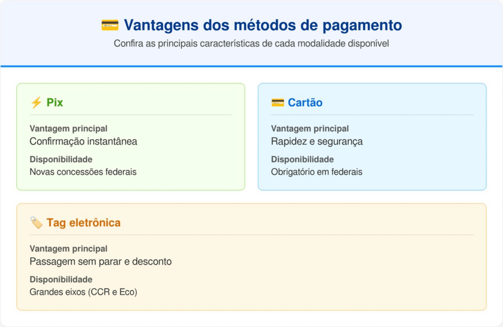 Desde junho de 2025, a Decisão SUROD nº 633 da ANTT obriga que as rodovias federais concedidas à iniciativa privada ofereçam ao menos quatro opções distintas de quitação. Além do papel-moeda, as cabines precisam estar preparadas para transações via Pix, cartões de débito e crédito, e os tradicionais dispositivos de cobrança automática (tags).