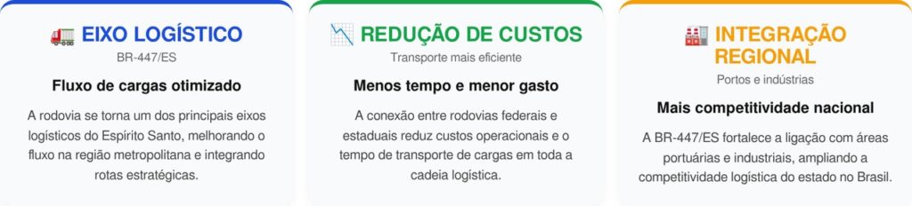A nova rodovia será um dos principais eixos logísticos do Espírito Santo, melhorando significativamente o fluxo de cargas na região metropolitana. A conexão direta entre rodovias federais e estaduais deve reduzir custos e tempo de transporte. Veja os impactos regionais da rodovia: