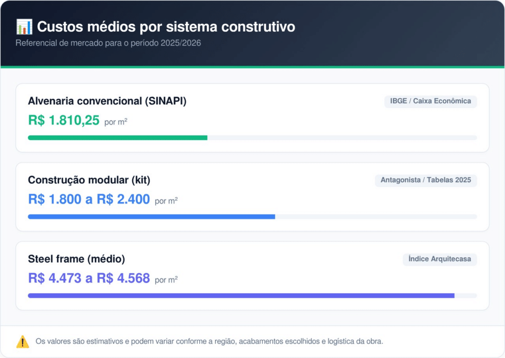 Abaixo, comparamos os custos médios por sistema construtivo: