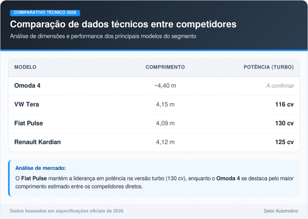 O grande diferencial do lançamento é o comprimento de aproximadamente 4,40 m, bem acima dos concorrentes diretos. O entre-eixos ainda não foi confirmado oficialmente pela Omoda & Jaecoo para a versão brasileira. Para referência, o Jeep Compass 2026 tem entre-eixos de 2,63 m e comprimento de 4,40 m, sendo um modelo de categoria acima. O Fiat Pulse mede 4,09 m de comprimento, e o Renault Kardian, 4,12 m.