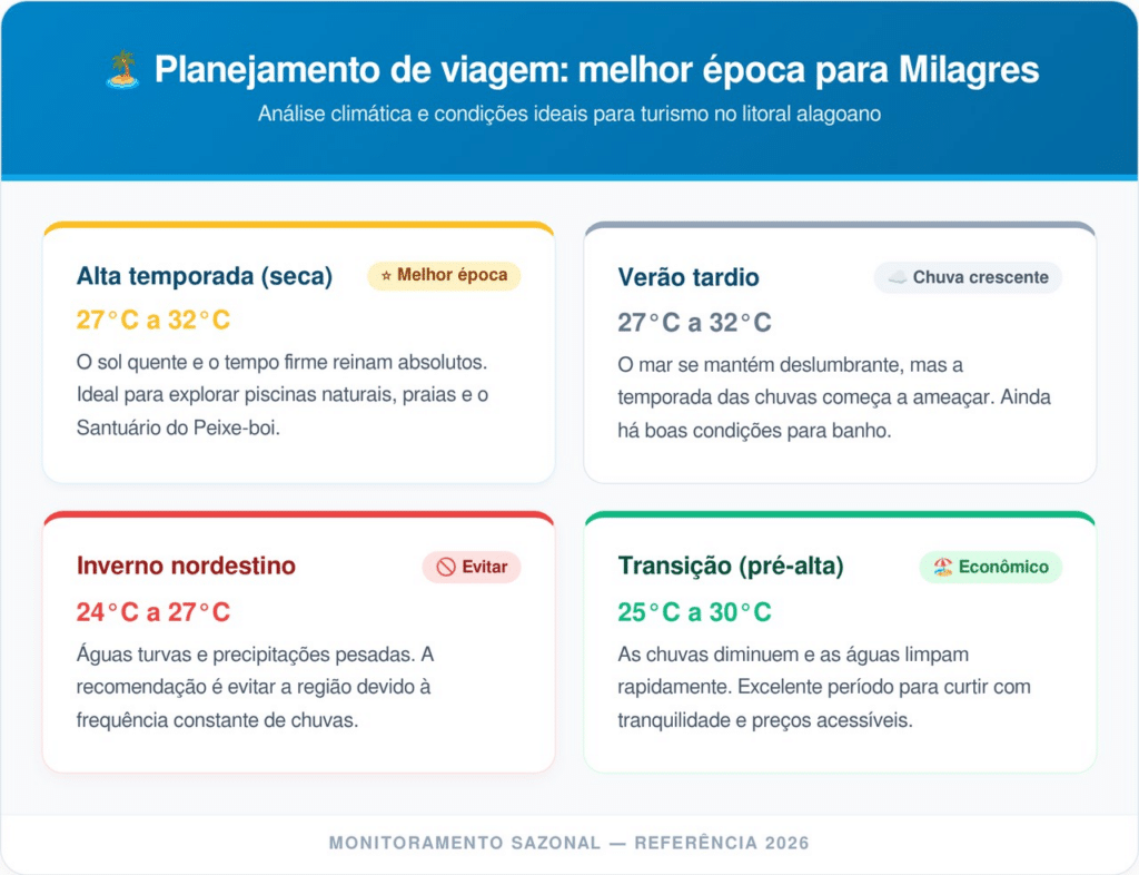 O clima de São Miguel dos Milagres segue o padrão do litoral nordestino: calor o ano todo, com período seco de outubro a março e estação chuvosa de abril a agosto. A escolha da época e da fase lunar define completamente a experiência: