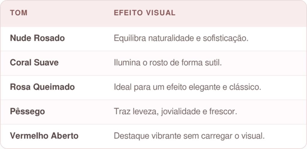 As cores de batom mais indicadas são aquelas que trazem frescor e naturalidade, evitando contrastes excessivos e priorizando tons que harmonizam com a pele.