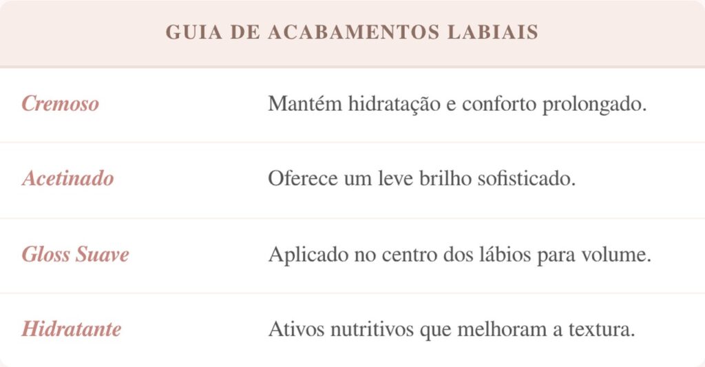 Escolher o batom ideal vai além da cor; o acabamento é o que define o conforto e o estilo final da maquiagem. Para ajudar você a encontrar a textura perfeita, apresentamos este Guia de Acabamentos Labiais: