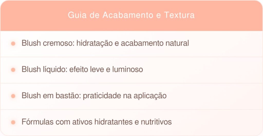 Blush em textura cremosa é uma das melhores opções para pele madura, pois oferece acabamento hidratante e evita marcar linhas de expressão. Já os blushes líquidos também são ótimos para garantir leveza e naturalidade.
