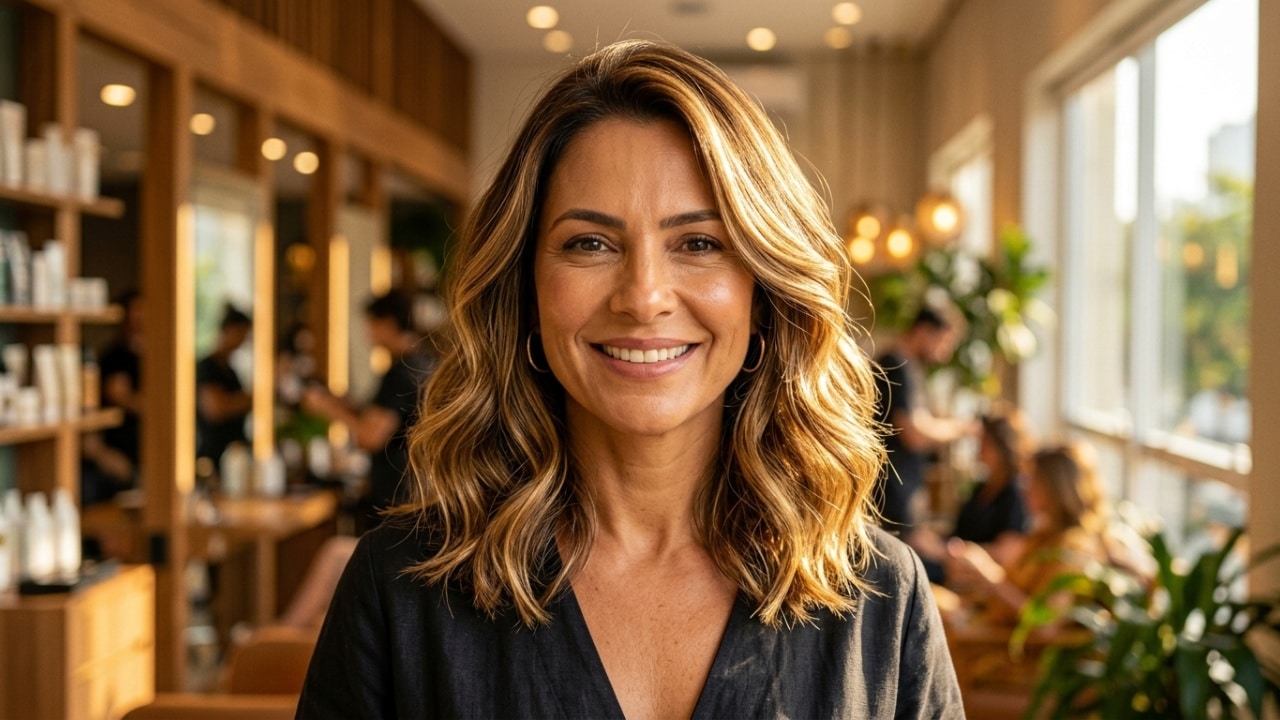 Evite tons muito escuros e sólidos, que podem criar sombras indesejadas no rosto e evidenciar imperfeições. A combinação de um corte em camadas com luzes discretas cria uma profundidade que faz o cabelo parecer mais cheio e brilhante, finalizando a transformação com sucesso.