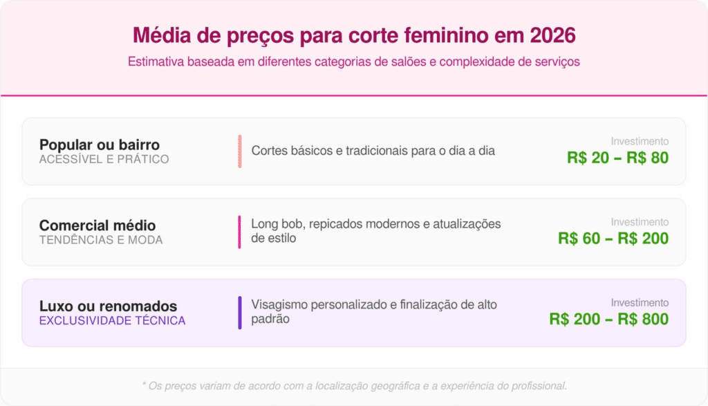 Os valores praticados em 2026 variam significativamente conforme a região e a infraestrutura do estabelecimento escolhido. Em metrópoles como São Paulo, a técnica de visagismo aplicada por profissionais renomados costuma elevar o investimento final.