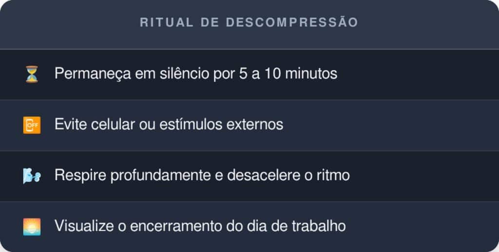 Uma estratégia simples dentro do autocuidado é criar uma transição consciente entre o trabalho e a vida pessoal. O intervalo de descompressão ajuda o cérebro a reduzir o estado de alerta.