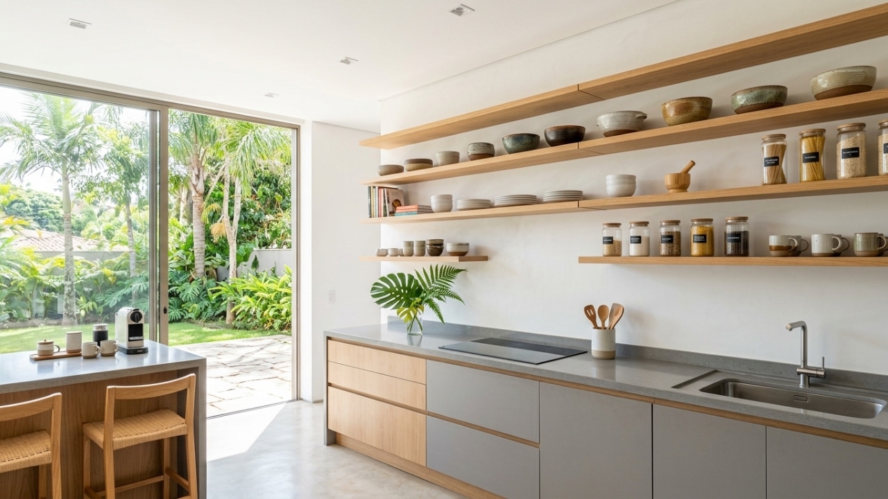 Adeus ao armário de cozinha representa uma mudança de mentalidade no planejamento de ambientes. Os armários fechados, muitas vezes volumosos, estão sendo substituídos por estruturas mais leves e acessíveis. Essa transição melhora a circulação visual, amplia a sensação de espaço e facilita o acesso aos utensílios, contribuindo para uma rotina mais fluida e eficiente na cozinha.