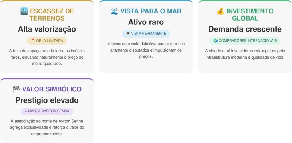 A valorização está diretamente ligada à escassez de terrenos na orla. Imóveis com vista permanente para o mar se tornaram ativos raros, impulsionando os preços e atraindo investidores. Veja os detalhes: