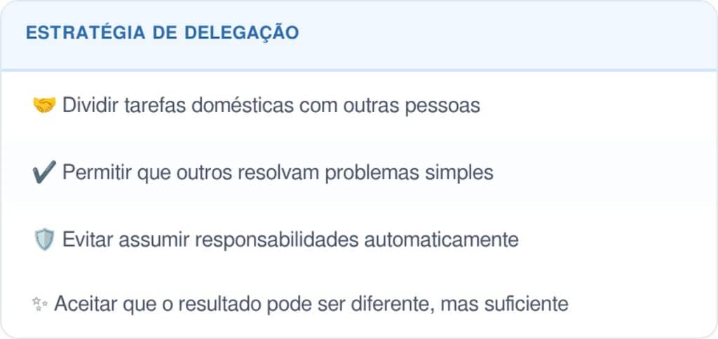 Delegar tarefas simples é uma prática poderosa dentro do autocuidado emocional. Muitas vezes, a dificuldade está na crença de que tudo precisa ser feito por você. A técnica do questionamento ajuda a quebrar esse padrão. Perguntar “Se eu não fizer, o que de pior acontece?” cria espaço para novas decisões.