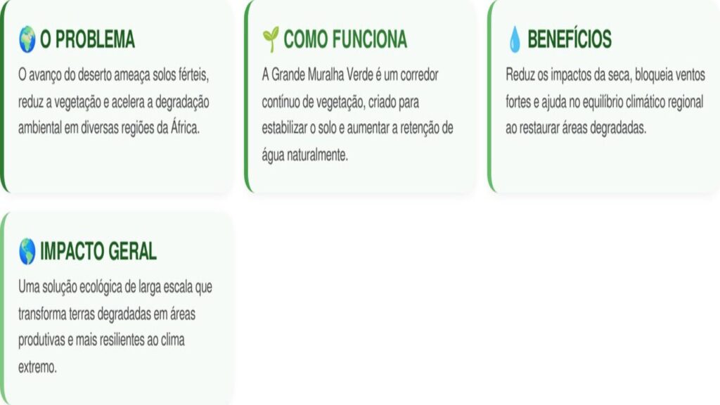 O plano envolve o plantio de árvores e a regeneração do solo em uma faixa que se estende próximo ao Deserto do Saara. A proposta é criar uma “parede viva” capaz de frear o avanço da desertificação e melhorar a qualidade de vida das populações locais.