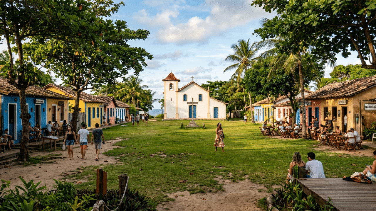 A igreja foi construída de costas para o mar, para parecer um forte e afugentar invasores. Trancoso, distrito de Porto Seguro no litoral sul da Bahia, nasceu como aldeamento jesuíta e hoje atrai viajantes do mundo inteiro com um centro histórico intacto, casinhas coloridas, praias de água cristalina e restaurantes que misturam dendê com técnica de alta cozinha.