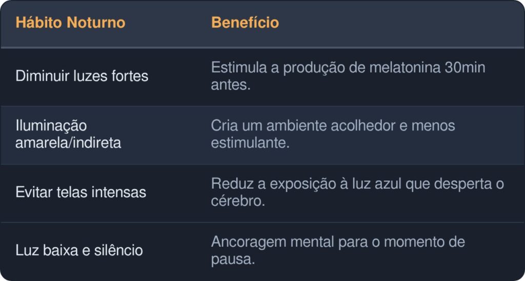 O Ritual da Luz Baixa é um comando biológico simples que sinaliza ao corpo que o dia está terminando. A redução gradual da iluminação ajuda a ativar mecanismos naturais de relaxamento e preparação para o descanso. Esse tipo de estímulo ambiental é interpretado pelo sistema nervoso como segurança, permitindo que o corpo reduza a atividade e entre em estado de repouso mais profundo.
