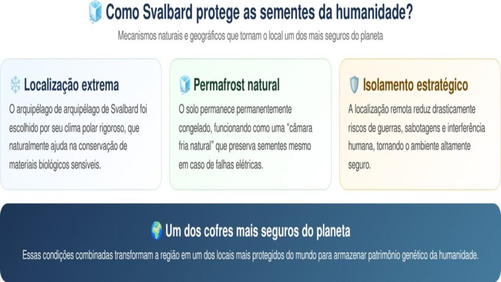A localização em Svalbard foi escolhida por suas condições naturais extremas e altamente seguras. O solo congelado permanentemente, conhecido como permafrost, ajuda a manter as sementes preservadas mesmo em caso de falhas elétricas. Veja os detalhes: