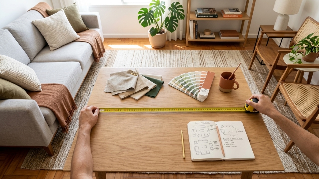 Antes de comprar, observe medidas, altura, largura e profundidade. Um item bonito isoladamente pode não funcionar no ambiente se não respeitar a escala do espaço.