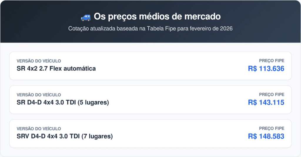 Os preços variam conforme a motorização e a configuração de assentos. As versões flex costumam ter um valor de entrada mais acessível, enquanto as variantes a diesel são as mais procuradas por quem viaja longas distâncias ou exige maior durabilidade do motor.