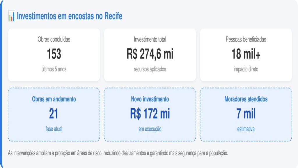 Nos últimos cinco anos, a Prefeitura concluiu 153 obras de contenção de encostas, somando um investimento de R$ 274,6 milhões. Essas ações já beneficiaram diretamente mais de 18 mil pessoas em diversas áreas da cidade.