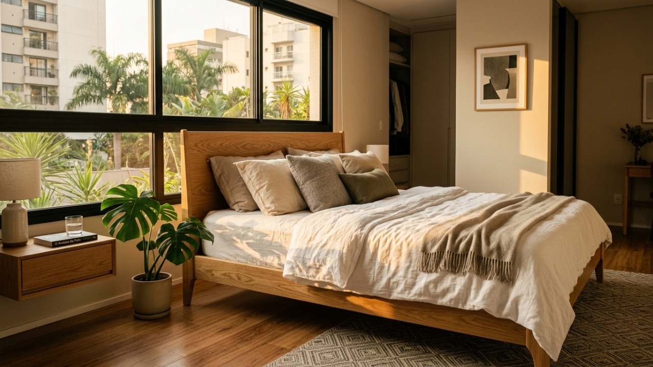 A substituição ocorre por modelos estofados ou de madeira que ficam ligeiramente elevados, criando amplitude no dormitório. Essa mudança acompanha a busca por refúgios relaxantes, onde o mobiliário volumoso cede lugar a peças versáteis que não sacrificam o estilo em nome da organização interna.