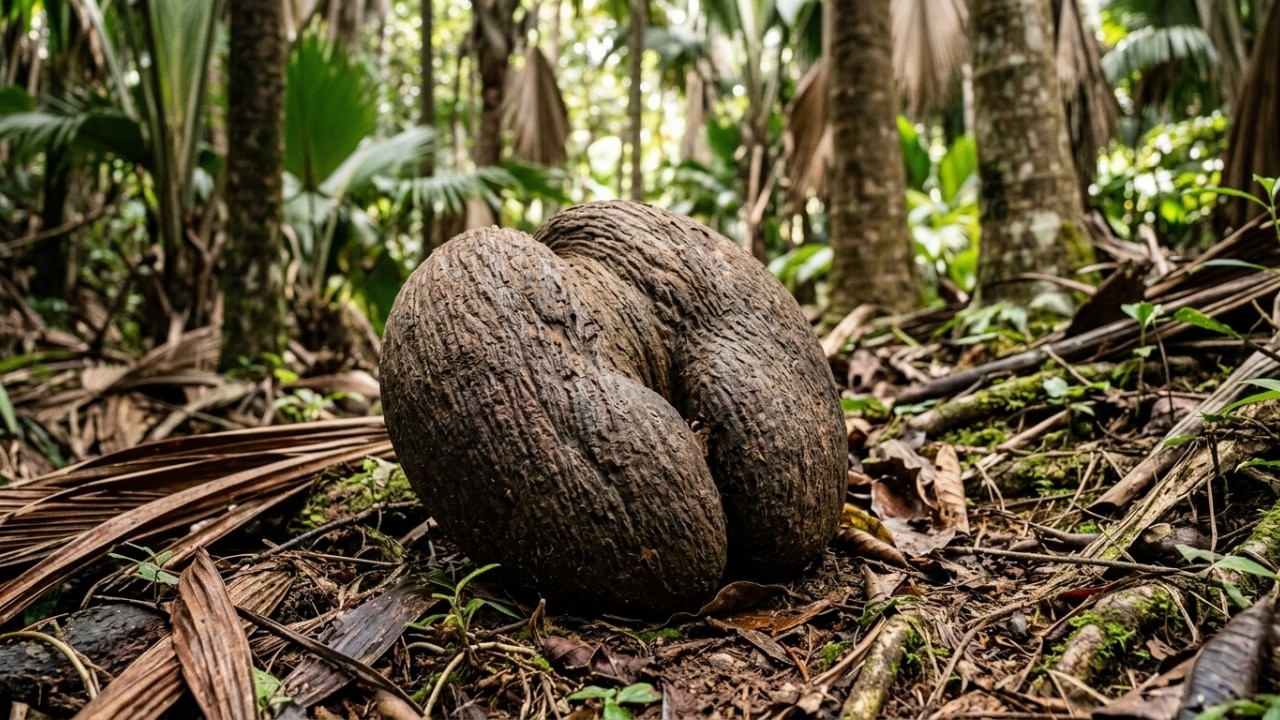 Uma semente gigante de até 50 cm e dezenas de quilos parece invenção, mas ela existe de verdade. Produzida pelo coco-de-mer, uma palmeira rara das Seychelles, essa estrutura chama atenção pelo tamanho, pelo peso e pelo formato tão incomum que parece quase esculpido à mão.