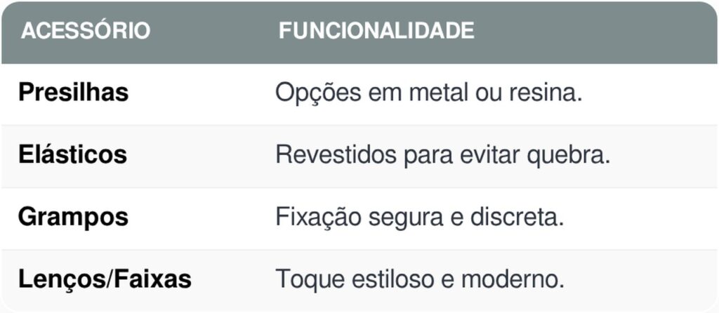 Acessórios são aliados poderosos para transformar penteados básicos em looks elegantes. Eles trazem praticidade e ajudam a variar o estilo sem necessidade de mudanças complexas no cabelo.Itens como presilhas, elásticos e grampos permitem criar diferentes combinações que se adaptam tanto ao ambiente profissional quanto ao casual.
