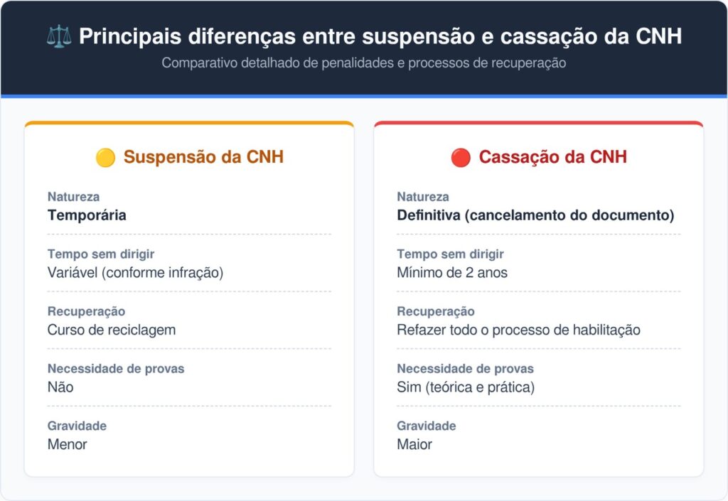 A suspensão é temporária e permite voltar a dirigir após cumprir o prazo e o curso de reciclagem, enquanto a cassação é mais grave, pois cancela a CNH e exige refazer todo o processo após 2 anos. Veja as diferenças principais: