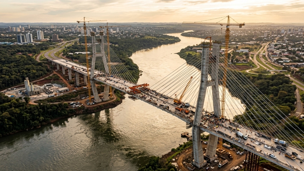 Esse percentual indica que a Ponte da Bioceânica entrou em uma etapa muito mais visível de consolidação. Quando uma obra desse porte supera a marca dos 80%, o impacto já não está apenas nos relatórios técnicos, mas na própria leitura da estrutura, que começa a se impor na paisagem como conexão quase completa.