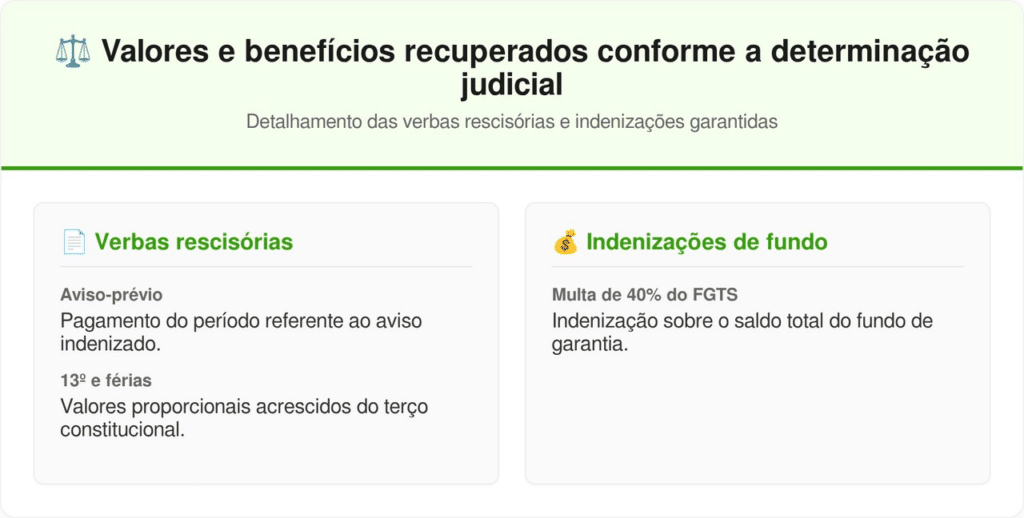 Com a conversão para dispensa sem justa causa, o profissional passou a ter direito às verbas rescisórias integrais previstas em lei. As fontes consultadas não confirmam condenação por danos morais, de modo que a linha correspondente foi removida da tabela abaixo.