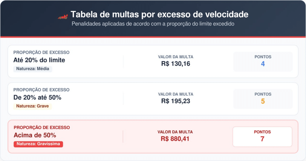 A legislação brasileira separa o excesso de velocidade em três níveis distintos, cada um com uma gravidade específica. Essa progressão garante que condutas mais perigosas recebam punições proporcionalmente maiores para desestimular o comportamento de risco nas estradas.