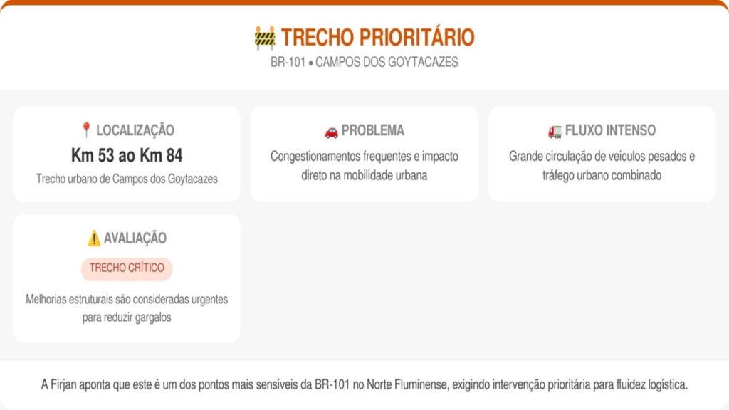 A Firjan destacou a necessidade de priorizar intervenções no trecho urbano de Campos dos Goytacazes, entre os quilômetros 53 e 84. A região sofre com congestionamentos frequentes e impacto direto na mobilidade. Veja os impactos no trecho: