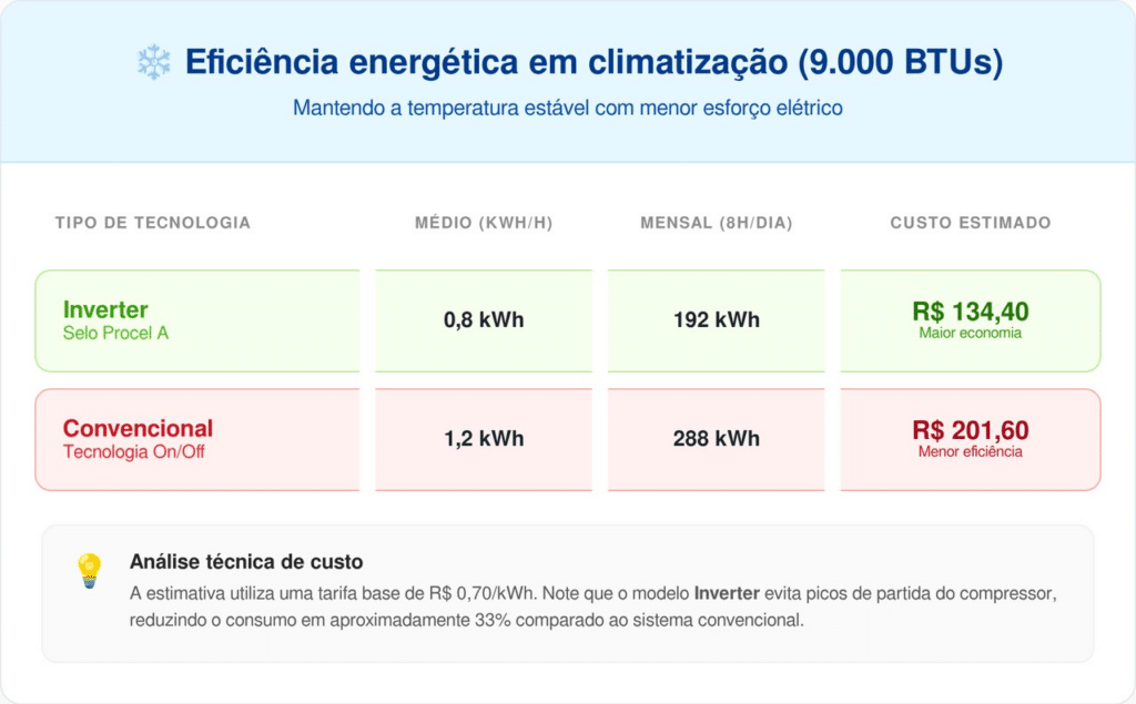 Se você possui um modelo convencional de 9.000 BTUs funcionando por oito horas diárias, o consumo mensal chega a aproximadamente 288 kWh. Já um modelo Inverter da mesma potência consome cerca de 192 kWh no mesmo período, conforme simulações de especializados em climatização.
