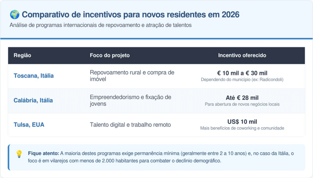 Existem regras estritas para evitar fraudes ou o uso do imóvel apenas para fins turísticos durante as férias de verão. Para compreender a competitividade deste programa, analise como ele se compara a outras iniciativas internacionais de atração de residentes: