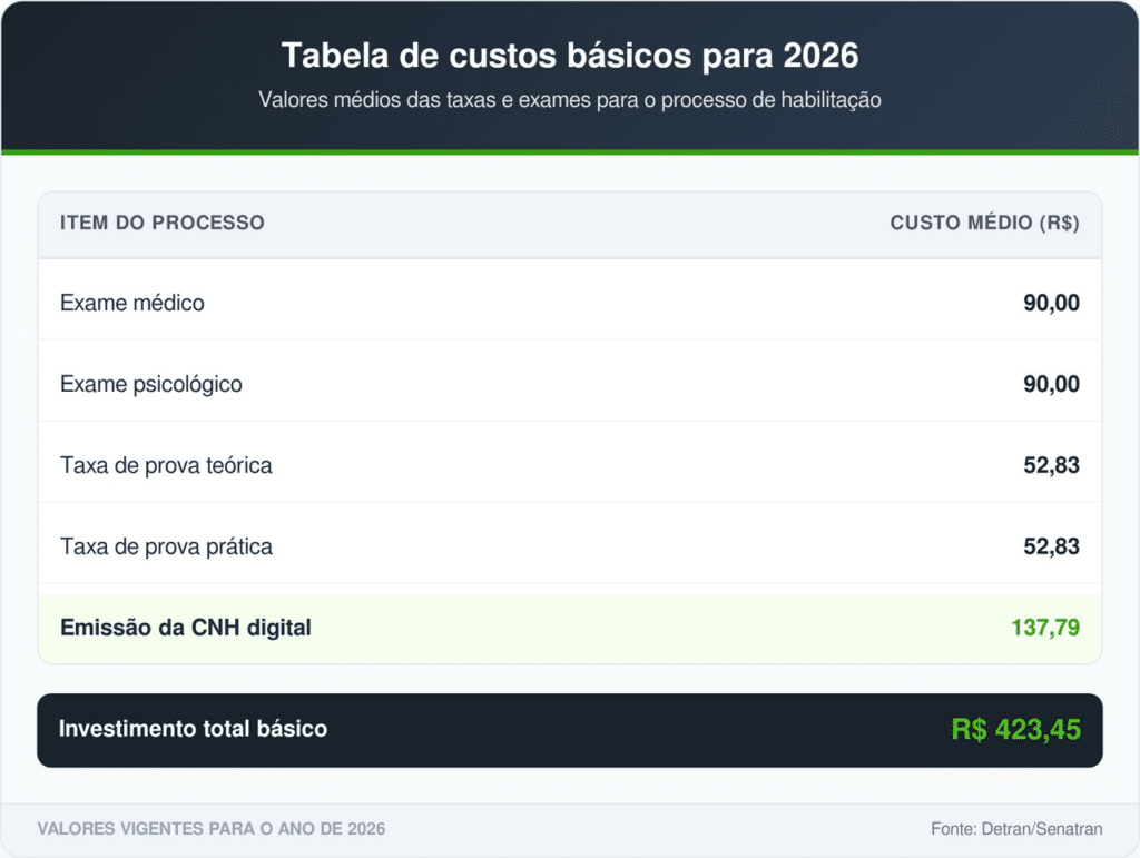 No estado de São Paulo, o Detran-SP implementou tetos de preços para exames clínicos e psicológicos. O valor total estimado para a categoria B (carro) agora flutua em torno de R$ 623,00, sem considerar as aulas práticas opcionais.