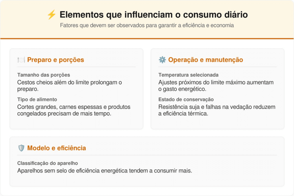 Além disso, abrir o cesto muitas vezes interrompe o fluxo de ar quente e obriga o aparelho a recuperar a temperatura ideal. Outros elementos também influenciam diretamente o consumo e devem ser observados no dia a dia: