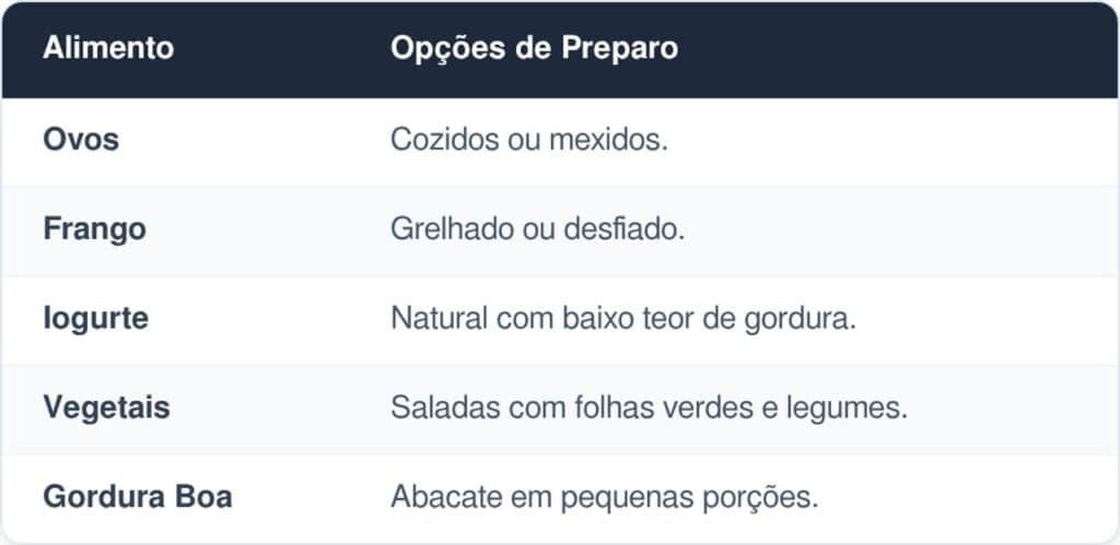 A tabela a seguir apresenta uma seleção de alimentos fundamentais e suas principais opções de preparo, servindo como um guia rápido para facilitar a montagem de um cardápio funcional e nutritivo no dia a dia: