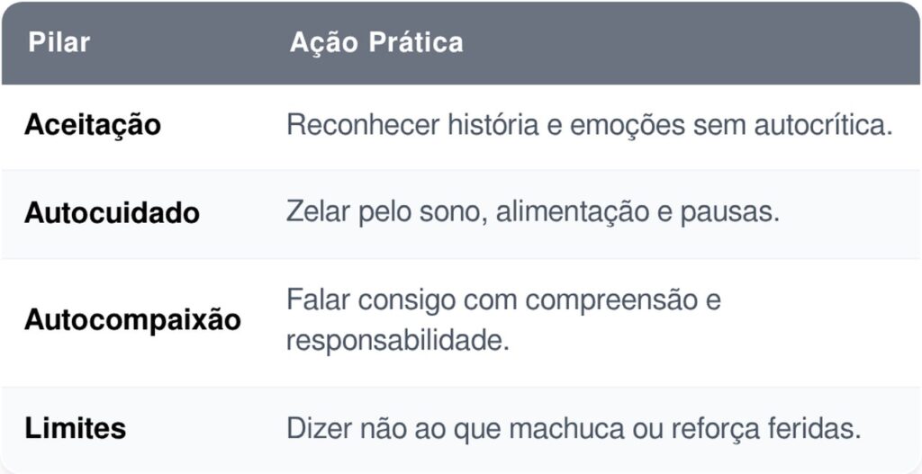 Adulto saudável é construído com escolhas diárias de cuidado consigo mesmo. Um jeito simples é organizar a reparentalização em quatro movimentos principais, que funcionam como bússola para decisões diárias.