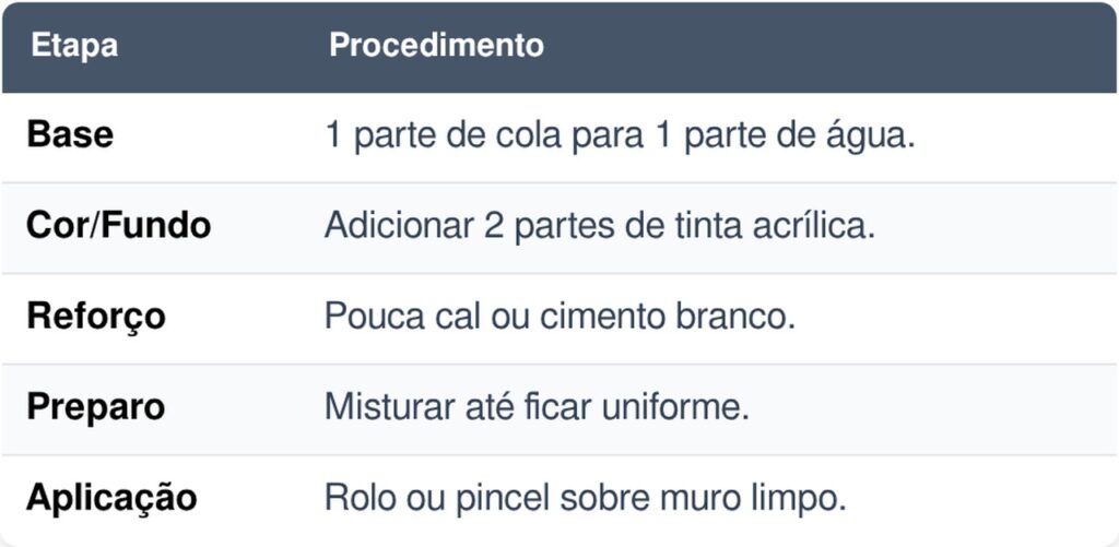 O preparo utiliza a cola branca (PVA) para garantir a aderência à superfície, água para atingir a diluição ideal, cal ou cimento branco para proporcionar resistência estrutural e tinta acrílica para o acabamento estético final, resultando em um processo de impermeabilização eficiente.