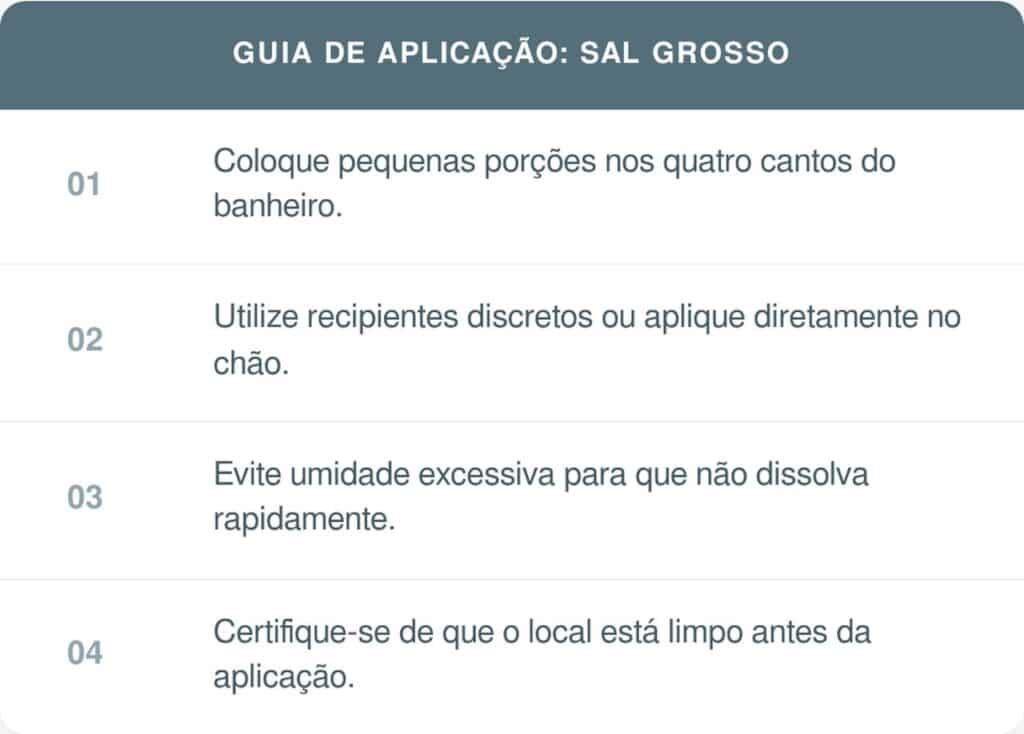 A aplicação do sal grosso deve ser feita de forma simples, mas com atenção à organização e à limpeza do ambiente. O objetivo é manter o espaço funcional e harmonizado.