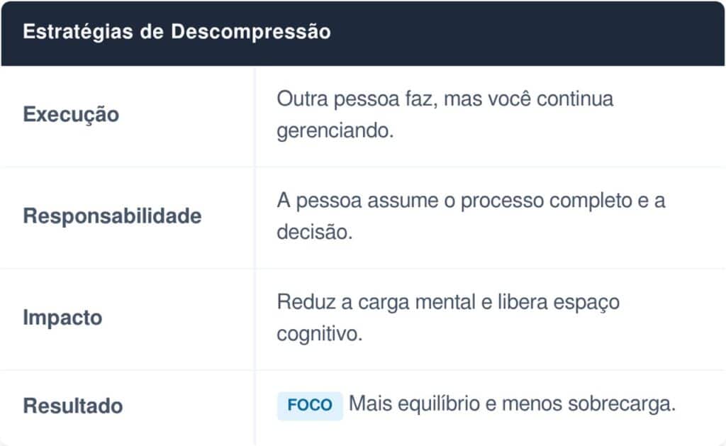 Muitas vezes, ao tentar dividir tarefas, ocorre apenas a delegação da execução, enquanto a responsabilidade continua centralizada. Isso significa que, mesmo sem fazer, a pessoa ainda precisa lembrar, cobrar e supervisionar. Delegar responsabilidade é transferir também o compromisso mental da tarefa, permitindo que o cérebro realmente se libere daquela demanda.