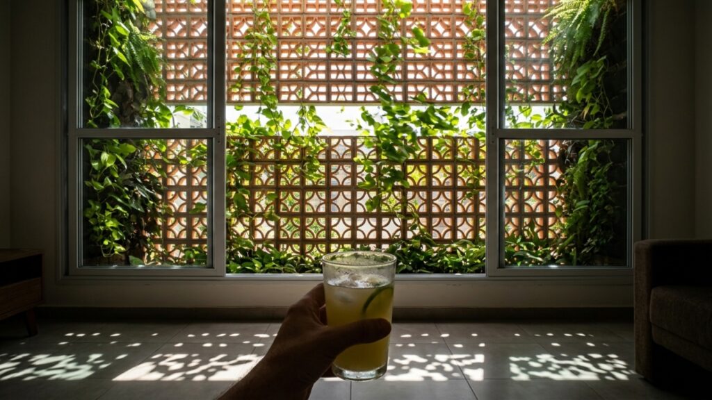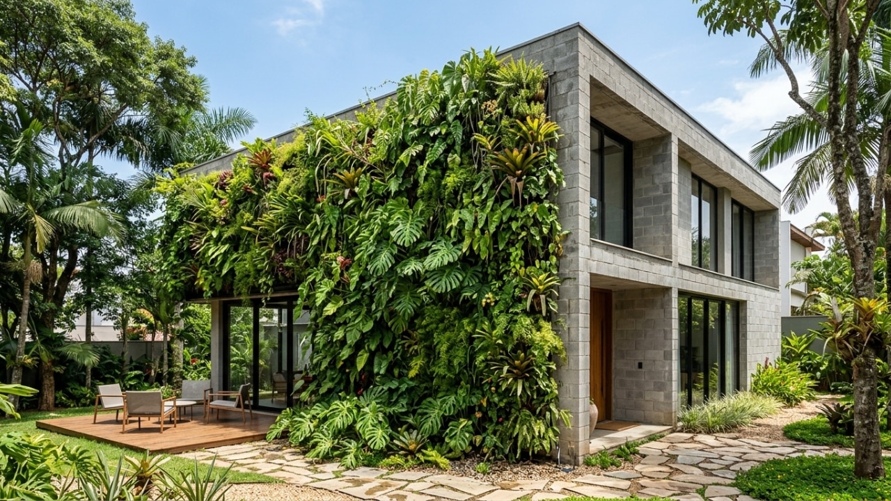 Uma casa de bloco acumula muito calor durante o dia, mas o uso estratégico de plantas nas fachadas pode reduzir a temperatura da superfície externa em até 10 °C a 12 °C e a temperatura interna em 2 °C a 5 °C, conforme estudos publicados pela Unicamp e pela UNESP. O método refresca os ambientes sem elevar a conta de energia elétrica.