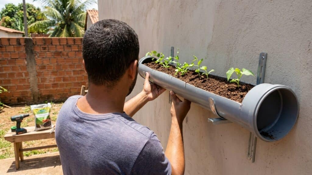 - Canos de PVC cortados horizontalmente para acomodar terra adubada.